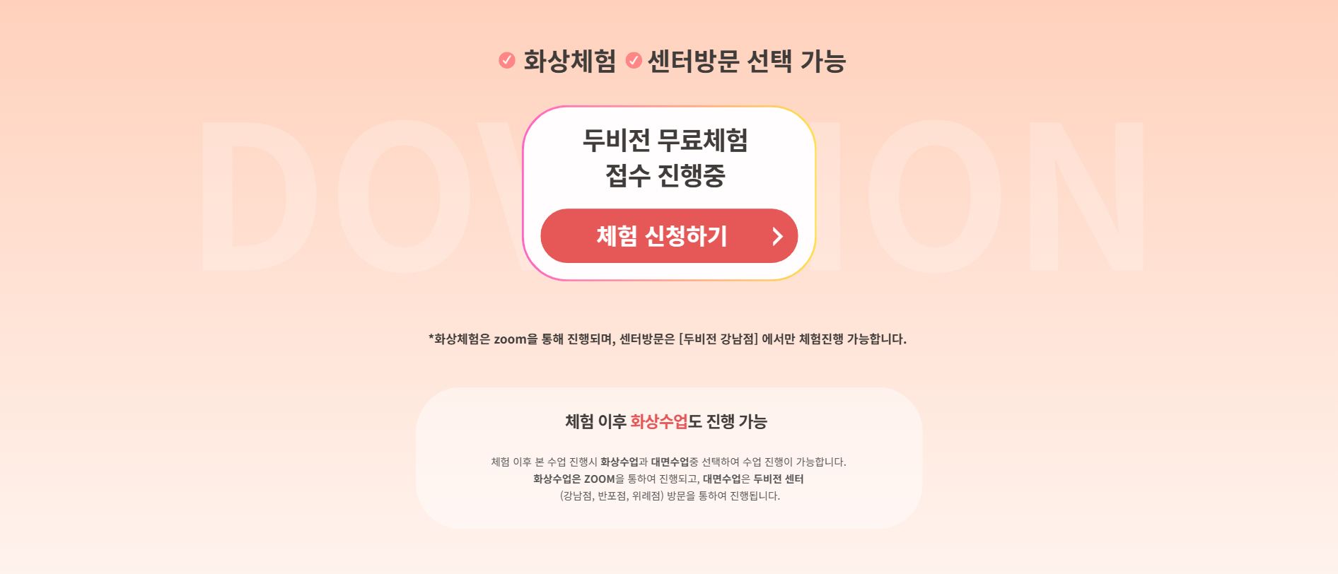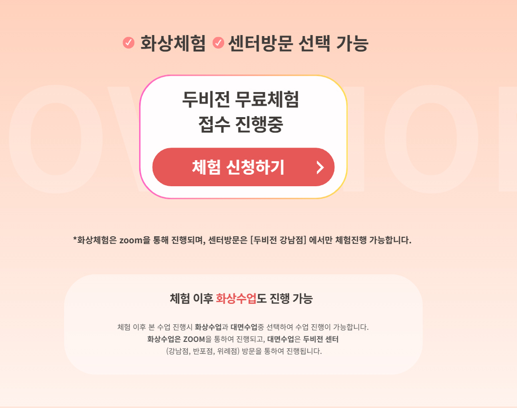 방문 체험은 [두비전 강남점]을 통해서만 진행하고 있습니다. 주소 확인 부탁드리겠습니다. (서울 강남구 논현로 72길 16 초원빌딩 3층)