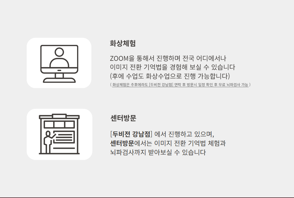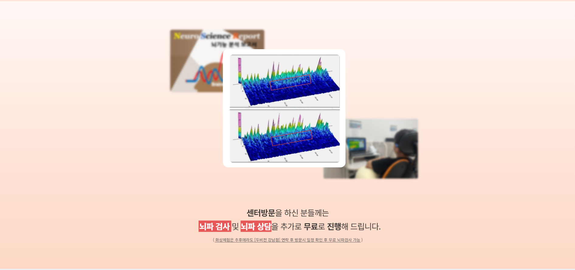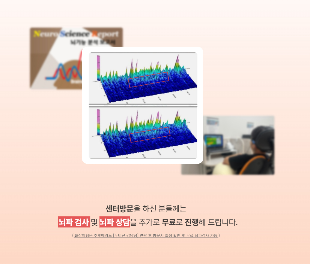 화상 체험을 진행하신 분들께서는 추후에라도 [두비전 강남점]을 방문하실 때 사전에 연락 주신다면, 가능한 시간대에 무료 뇌파 검사를 진행해 드리고 있으니 내용 확인 부탁드리겠습니다.