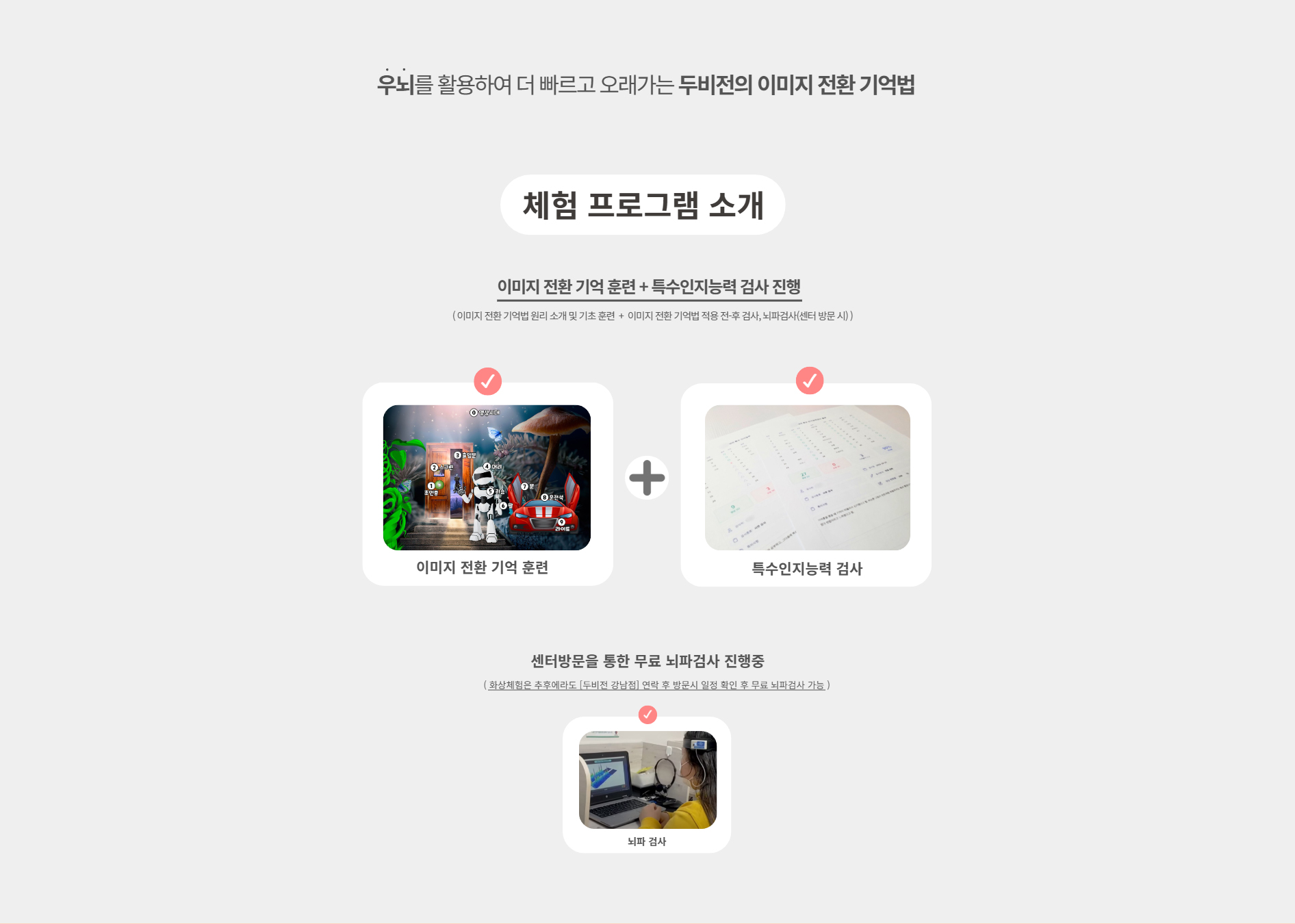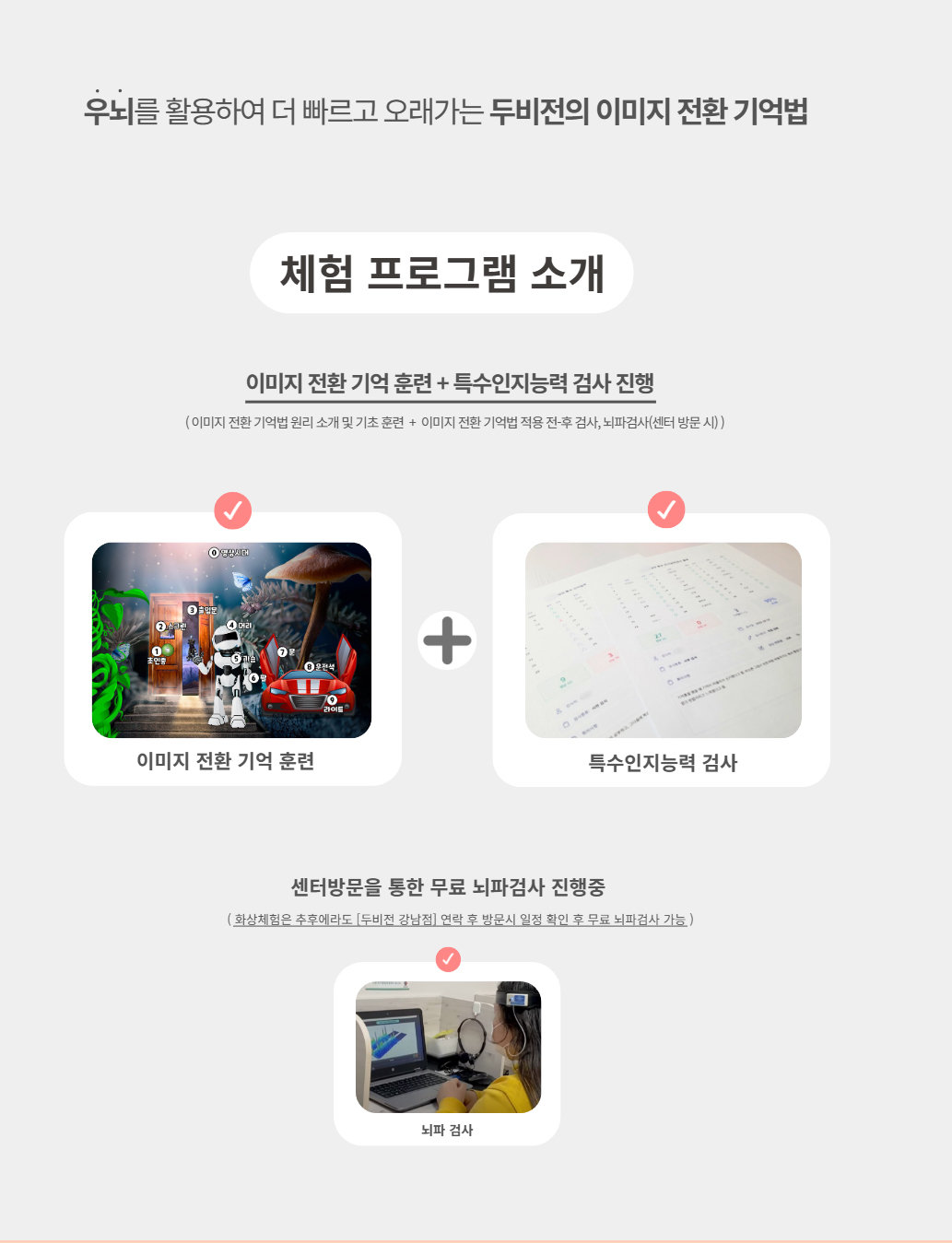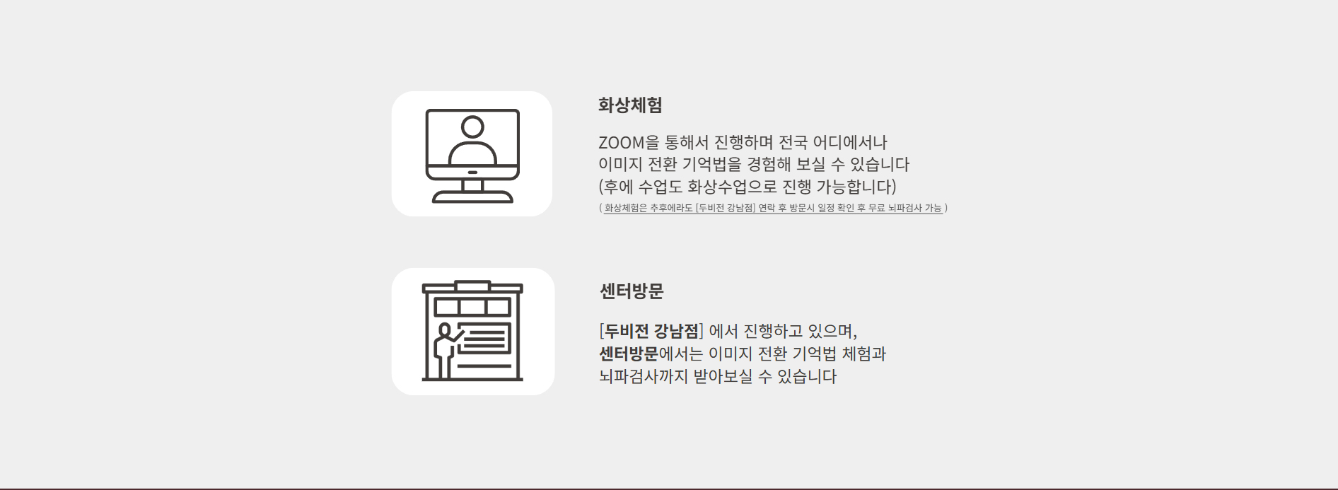 화상 체험을 진행하신 분들께서는 추후에라도 [두비전 강남점]을 방문하실 때 사전에 연락 주신다면, 가능한 시간대에 무료 뇌파 검사를 진행해 드리고 있으니 내용 확인 부탁드리겠습니다.