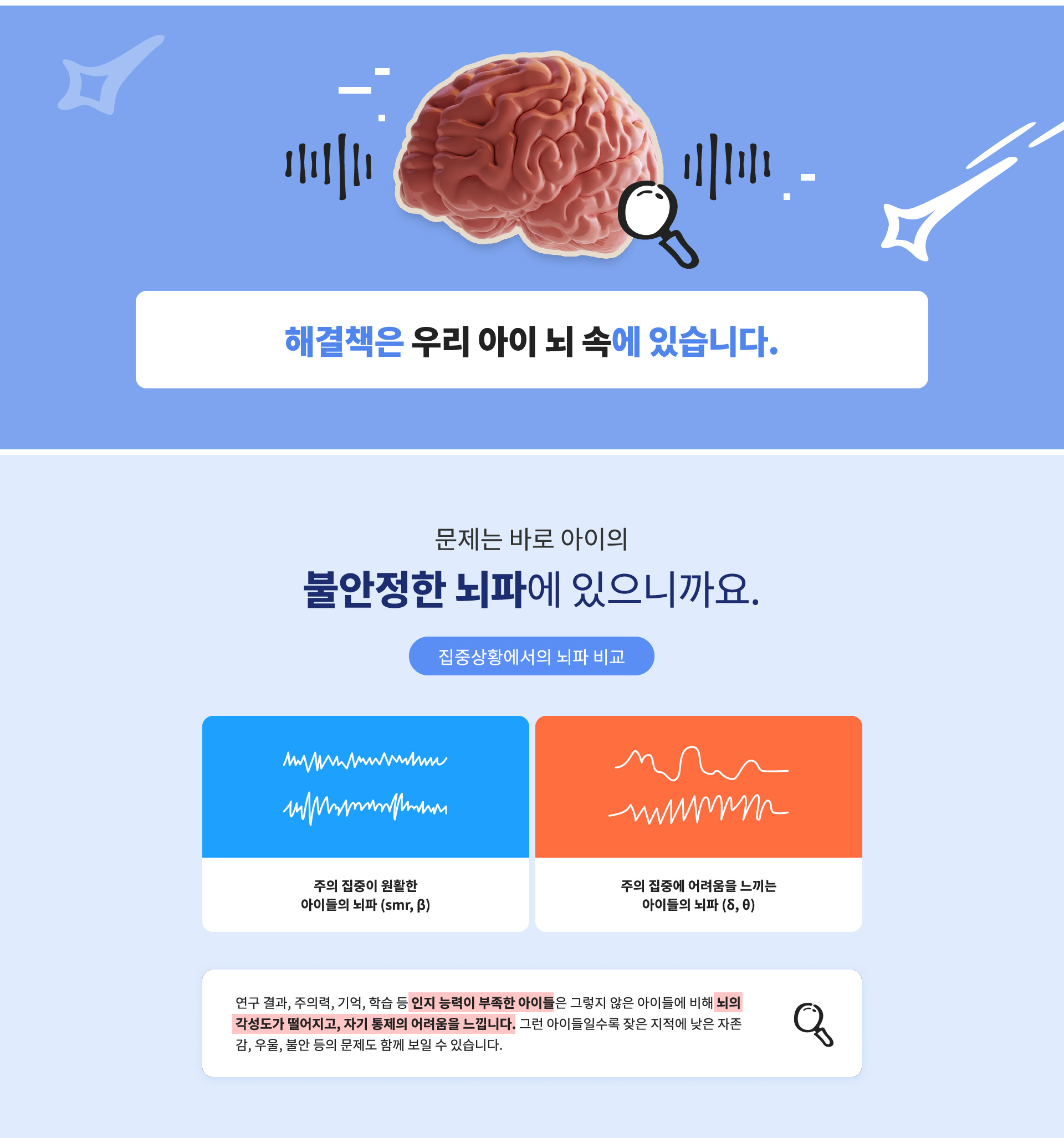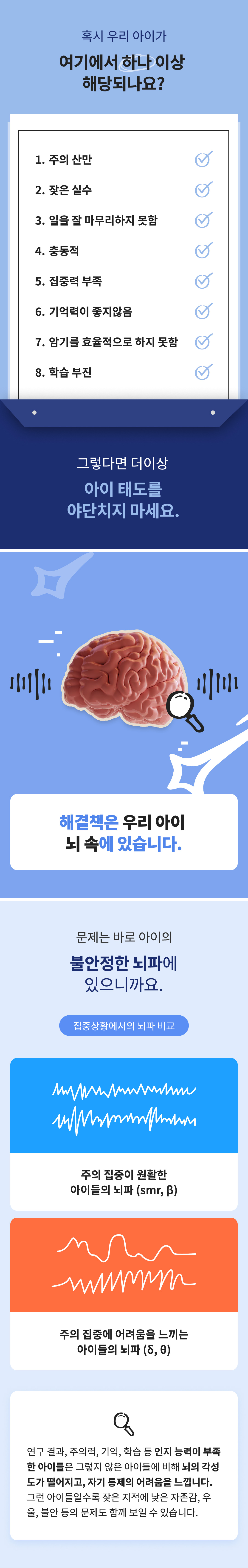 뇌파는 심박수와 마찬가지로 활동 상태를 반영해야하는데, 건강하지 못한 뇌는 집중해야되는 상황에서 수면 시의 뇌파를 발생시키거나, 수면 상황에서 각성 시 뇌파를 발생시키는 등 활동 상태와 맞지 않는 뇌파가 관찰됩니다. 주의력 부족, 수면 장애, 충동 조절 등 많은 문제들이 뇌파에서 확인되기때문에 아이의 뇌가 효율적으로 운용되고 있는지 파악하기 위하여 정기적인 뇌파 측정이 필요합니다.