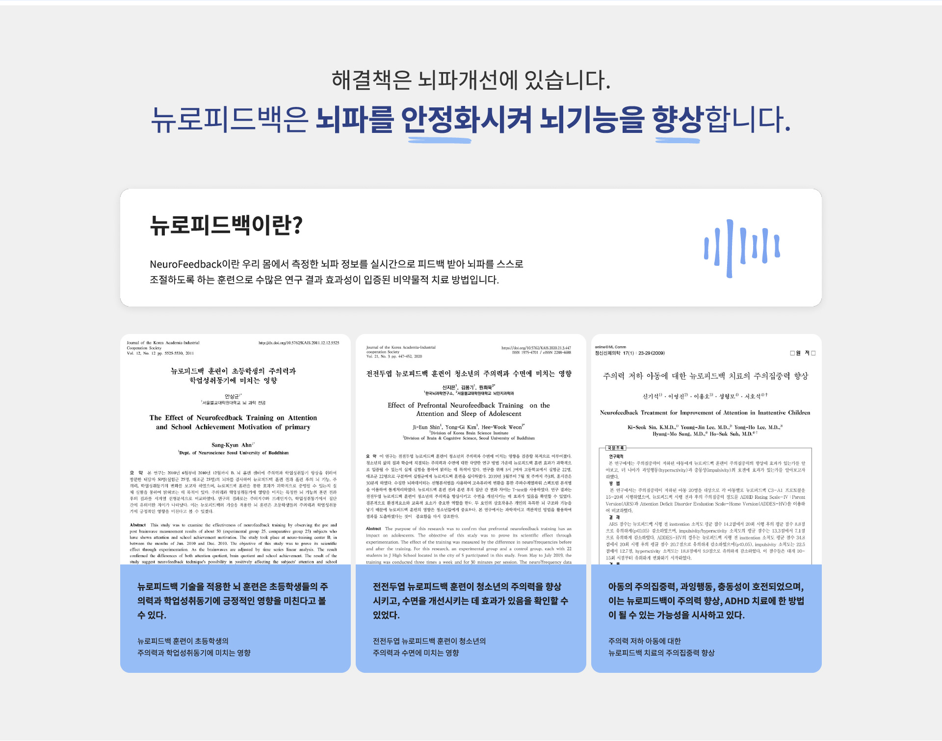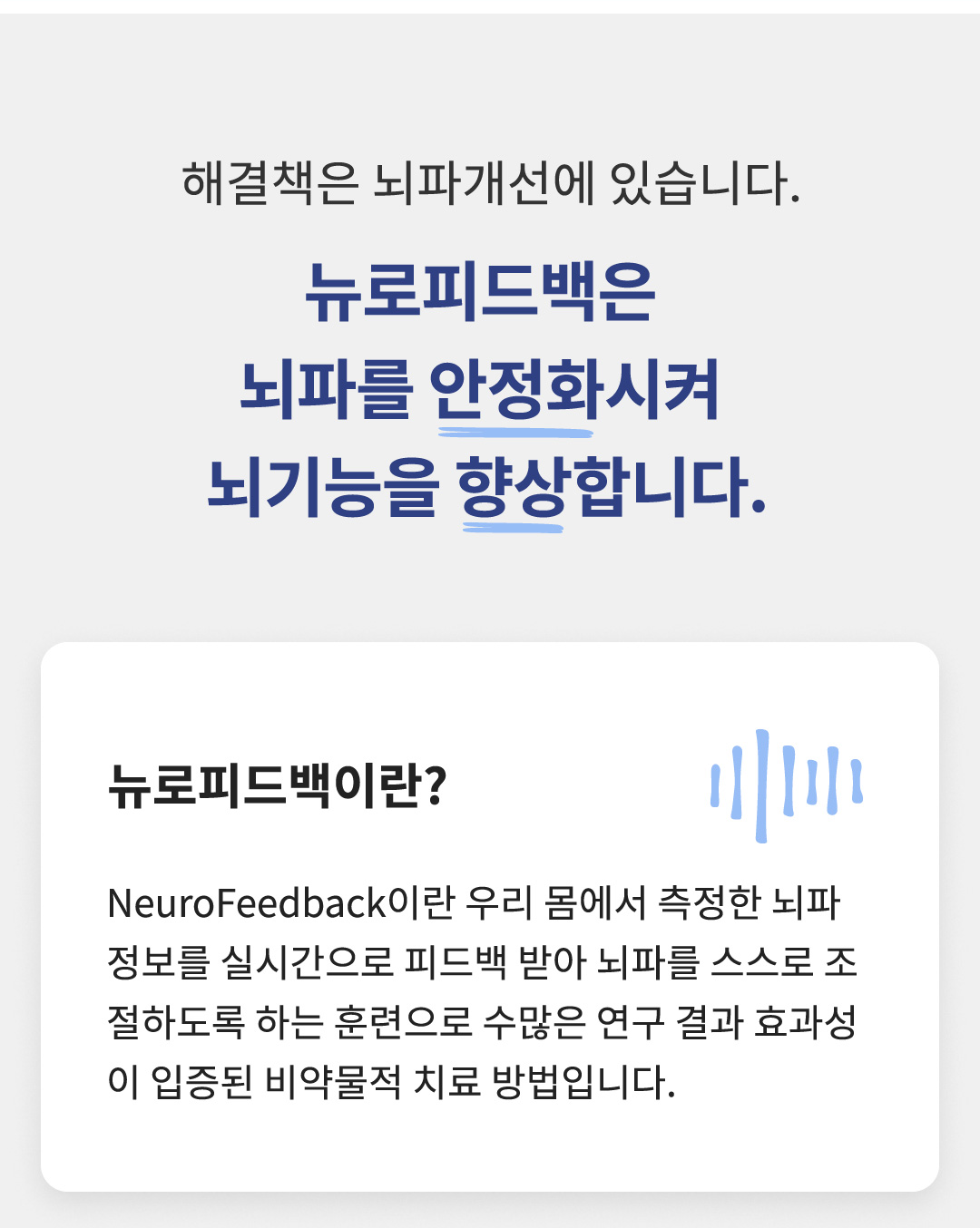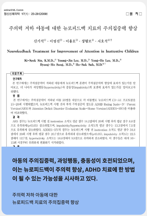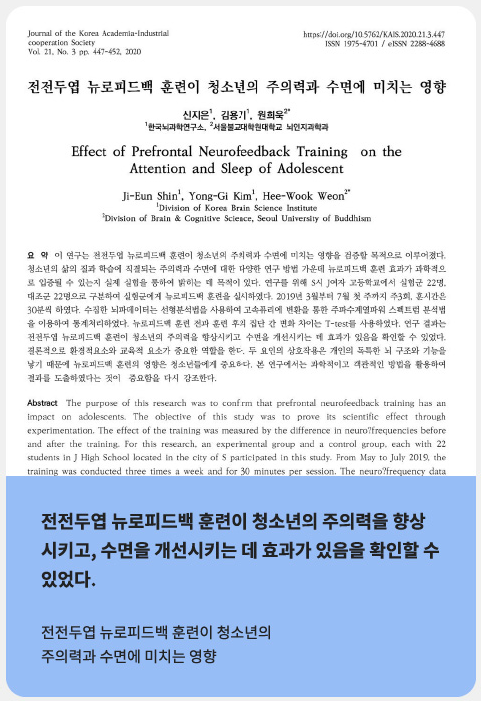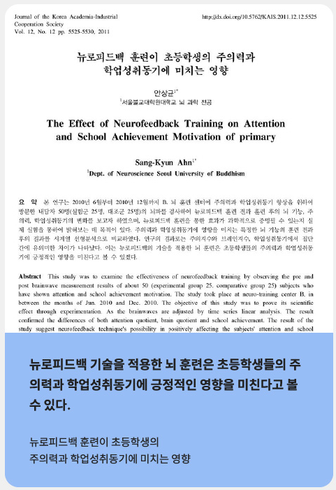 뉴로피드백을 통한 두뇌 기능의 안정화 및 좌 우뇌의 균형, 감정조절능력 강화, 주의집중력 강화, 정보처리 속도 향상 등 긍정적인 효과가 다양하게 보고되고 있습니다.